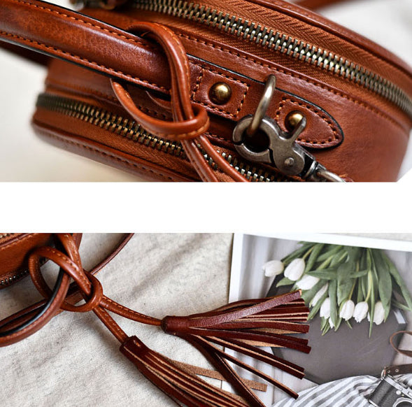 Sweet and Retro Appearance: Lovely round shape bag looks so sweet and elegant for girls. The crack pattern texture looks so natural and touches comfortable. Double zipper closures between the 2 compartments, with a large capacity, pull smoothly and all your belongings will be kept neatly. The tassels decoration attached to the soft leather handle looks so beautiful.